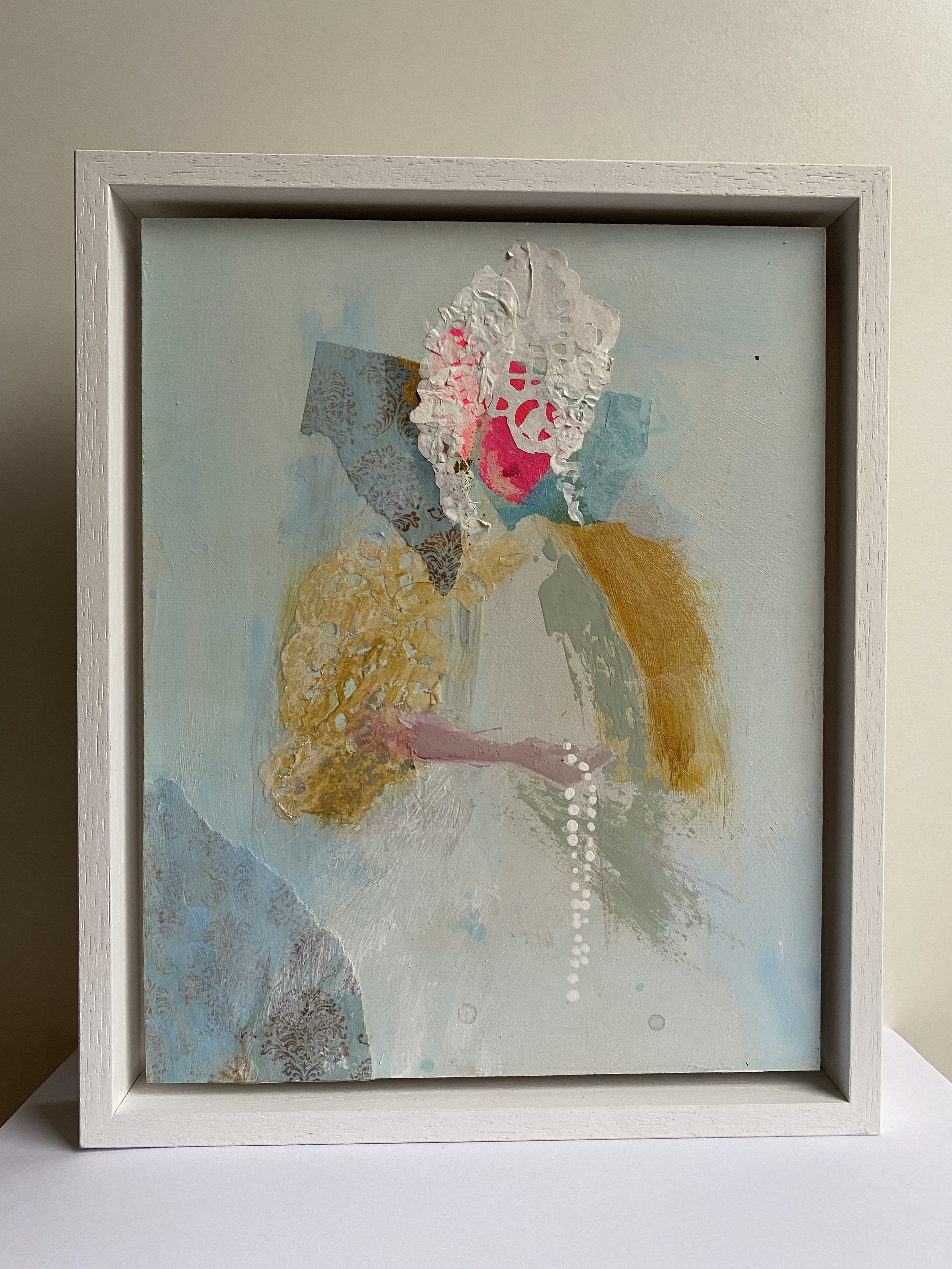 In deze reeks krijgen contouren karakter en krijgen karakters contour. Met kwast, kleur en een vleugje ironie worden dames tot leven gebracht die zich met hun oversized pruiken thuis lijken te voelen tussen poederdozen, porseleinen kopjes, en stilzwijgende oordelen. De semi-abstracte, gestileerde vorm van deze paneeltjes weerspiegelen de essentie van gracieuze schoonheid en klassieke charme. Meer is niet nodig.